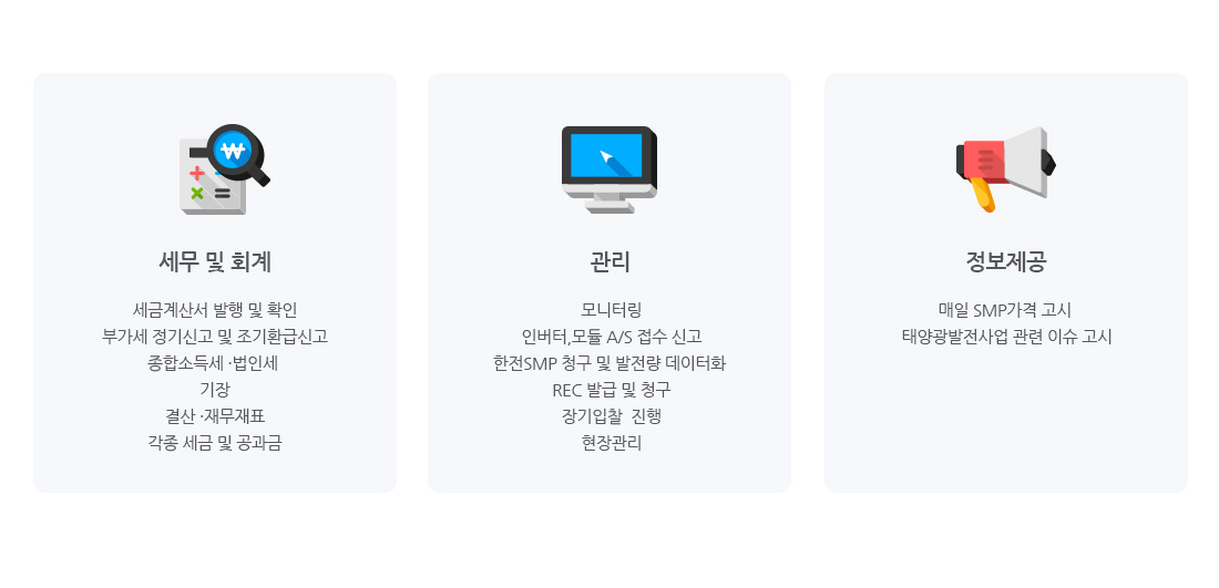 세무부터 매출·매입 등 재무관리를 시작으로 태양광 발전소의 통합 모니터링 서비스를 제공합니다.